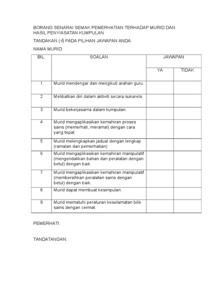 Borang Senarai Semak Pemerhatian Terhadap Murid Dan Hasil Penyiasatan Kumpulan Pdf