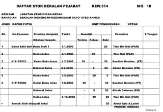 Contoh senarai stok. MDKD KEWPS-9 Senarai Stok Bertarikh Luput 42. Contoh peralatan tidak kekal. CONTOH URUSNIAGA MELIBATKAN BELIAN DAN JUALAN BARANG NIAGA pernyataan urusniaga penyediaan dokumen perniagaan dan pengemaskinian kad stok.