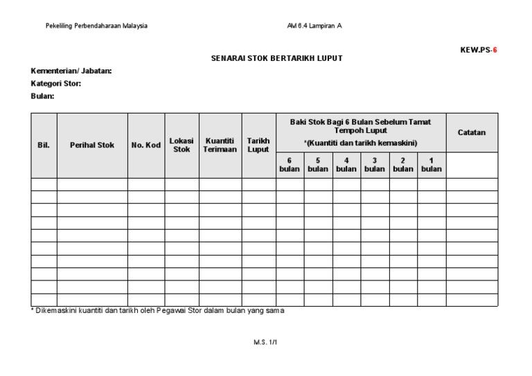 Mengurangi Kebutuhan Stok Aman 1. SENARAI STOK BERTARIKH LUPUT KEWPS-6 Perihal Stok Catatan Tarikh Luput Kuantiti Terimaan No. Senarai Semak Keperluan Dokumen Berdasarkan Urus Niaga Bil Tarikh Urus niaga.