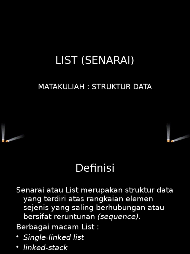 Berikan contoh kasus kapan sebuah Linked List lebih baik digunakan dan kapan sebuah Array lebih. Linked List yang juga sering disebut dengan senarai berantai merupakan struktur data yang terdiri dari urutan record data dimana setiap record data punya field yang. Tipe Tipe List List kosong.