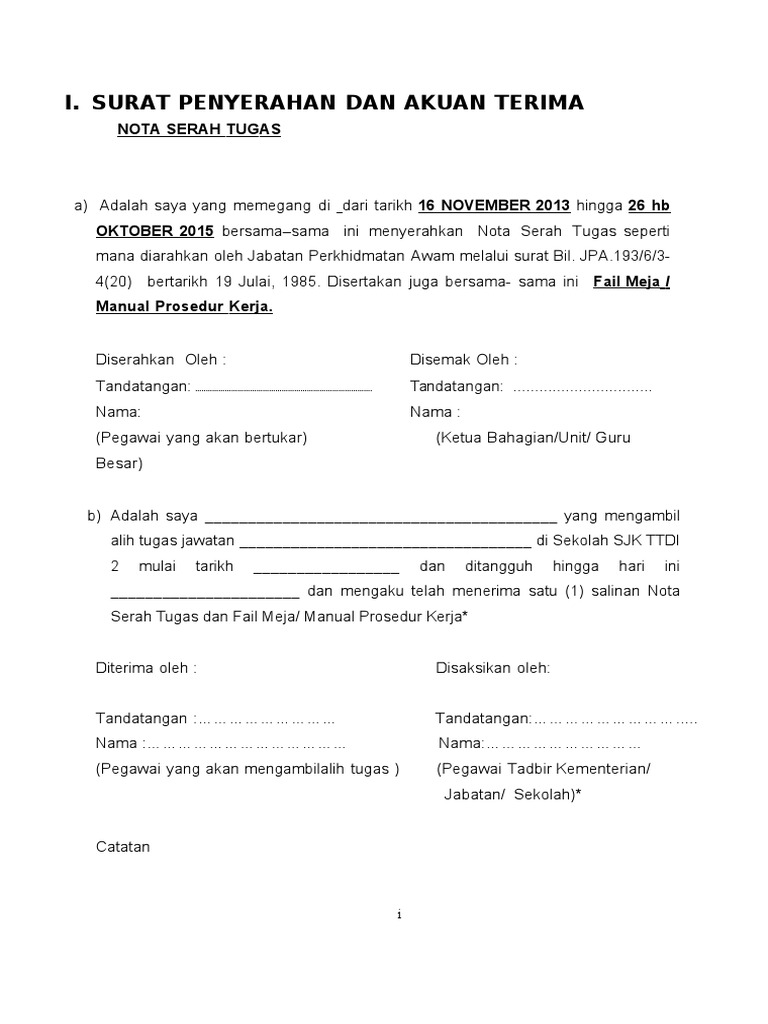 Kedudukan Kewangan Akaun dan Lain-Lain 6. Nota Serah Tugas ini seterusnya diserahkan kepada Pegawai yang mengambilalih jawatan tersebut dan Pegawai berkenaan hendaklah menandatangani Surat Akuan Terima Nota Serah Tugas. Lain lain Hal SURAT PENYERAHAN DAN AKUAN TERIMA NOTA SERAH TUGAS Adalah saya Nama Staf yang memegang jawatan.