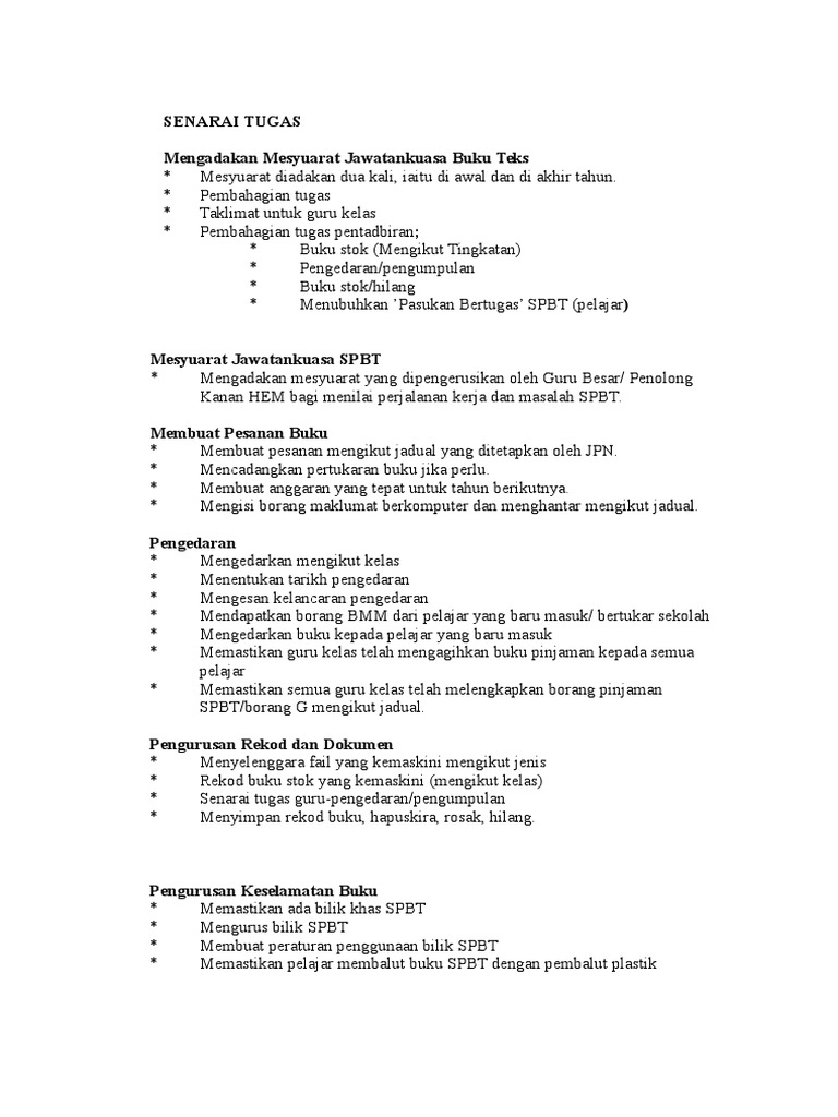 Pengerusi hendaklah menjalankan tugas-tugas seperti berikut. 422 Perkara 2 Senarai Tugas Jawatan Muka Surat ii Pegawai yang bertukar perlu menyenaraikan tugas-tugas sepertimana yang tercatat di dalam senarai tugas rasmi jawatan. 09 7964310 kod sekolah.