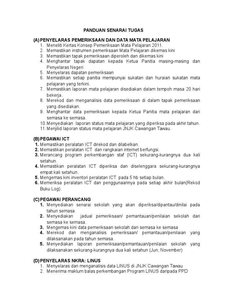 Manual Prosedur Kerja Hendaklah disertakan sebagai Lampiran A 2 viii VIII. SENARAI TUGAS GURU DATA Peringkat. Sebelum berakhir sesi persekolahan digalakkan untuk kita buat senarai semak tugas yang meliputi semua unit dan bahagian seperti kurikulum kokurikulum pentadbiran hal ehwal murid dan sebagainya.