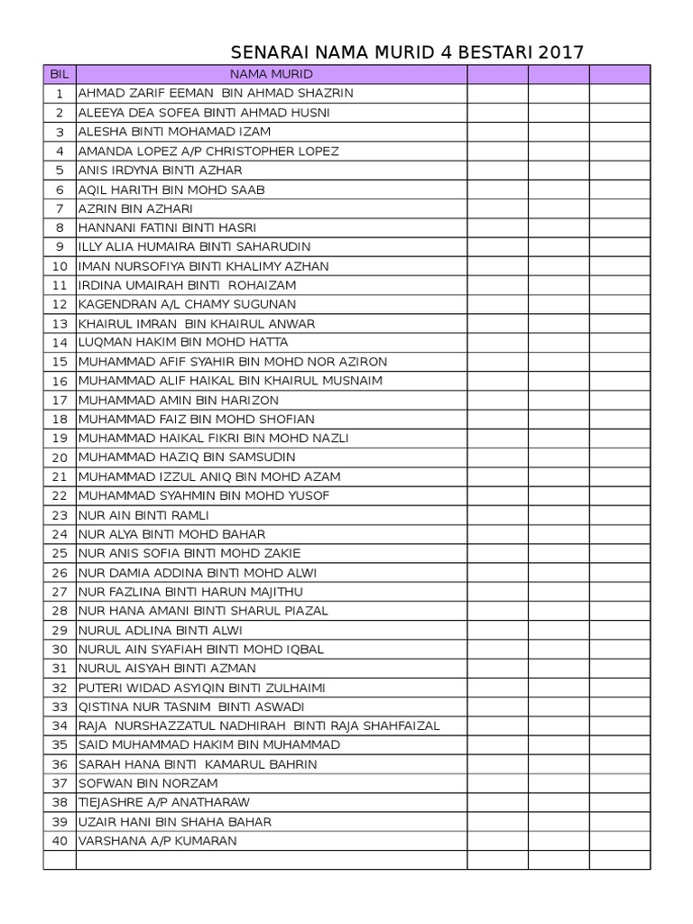 Senarai Nama Murid Tahun 4 2017 Pdf