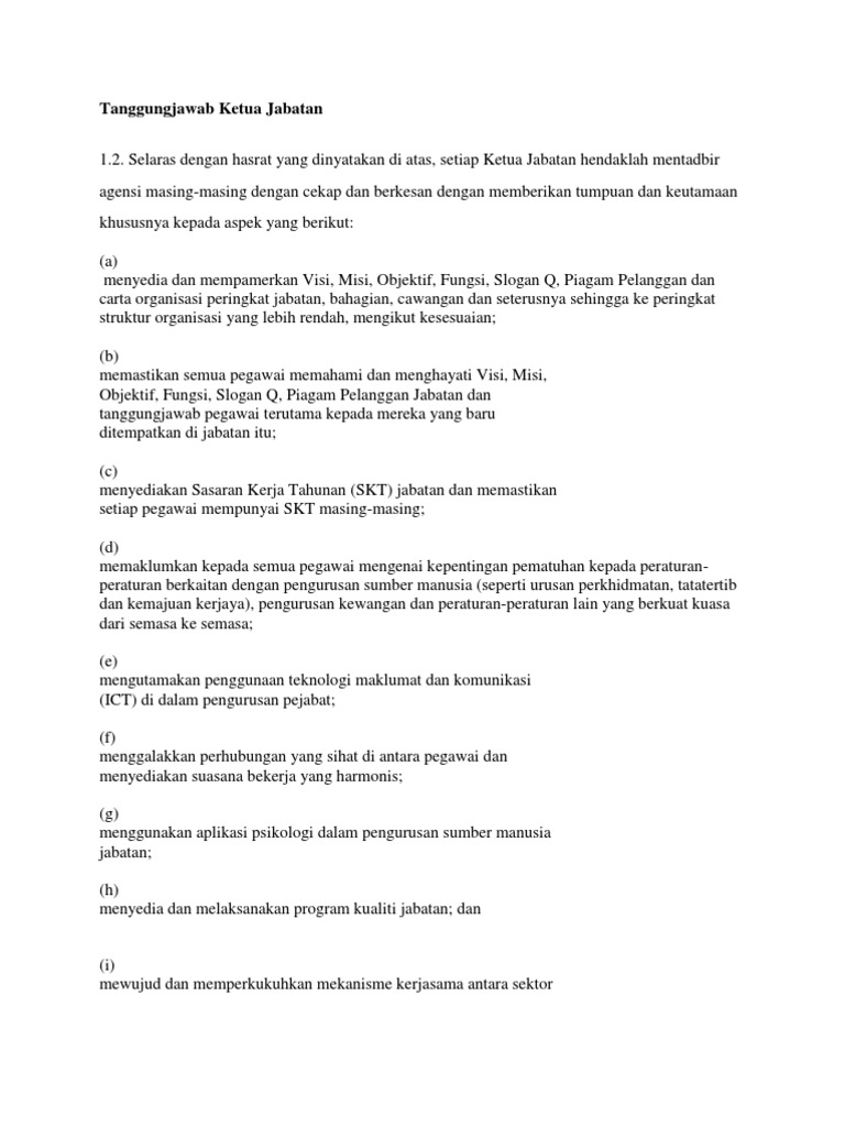 SENARAI TUGAS KETUA JABATAN 1. Ketua setiausaha kementerian ksu dan ketua jabatan yang. Menyampaikan apa-apa hal kesusahan anak-anak buahnya kepada Penghulu Mukim atau Pegawai Daerah dan menyelesaikan apa-apa perselisihan di kampung di antara anak-anak buahnya dengan jalan muafakat.